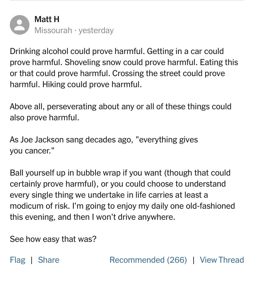 Reports of the dangers of the occasional drink have been greatly exaggerated. The former Surgeon General Vivek Murthy has claimed that “There is no safe level” of alcohol. But alcohol is not cyanide! The data show that although heavy drinking is unambiguously bad for us, light drinking at worst might very slightly increase the risk of developing some cancers. Derek Thompson strikes the right balance, in my opinion. He argues that warnings about the dangers of moderate drinking are “built on flawed studies and potentially overconfident conclusions.” He also offers a helpful way to think about risk and pleasure in our own lives: