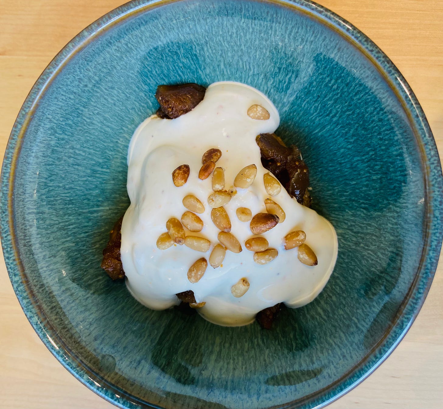 At least two hours before your party, assemble the puddings: Lay one shortbread cookie in each bowl. Spoon some figs over each cookie, along with a spoonful or so of the liquid. You want enough liquid to soften the cookies. Ladle about 1/4c of the crème fraîche mixture over the figs and top each pudding with about 1T of pine nuts. Keep in the fridge until just before serving.